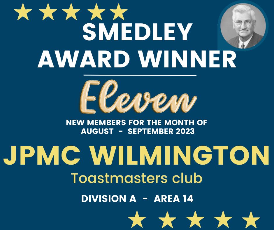 Congratulations, JPMC Wilmington Toastmasters Club, on achieving the Smedley Membership Building Award for 2023!